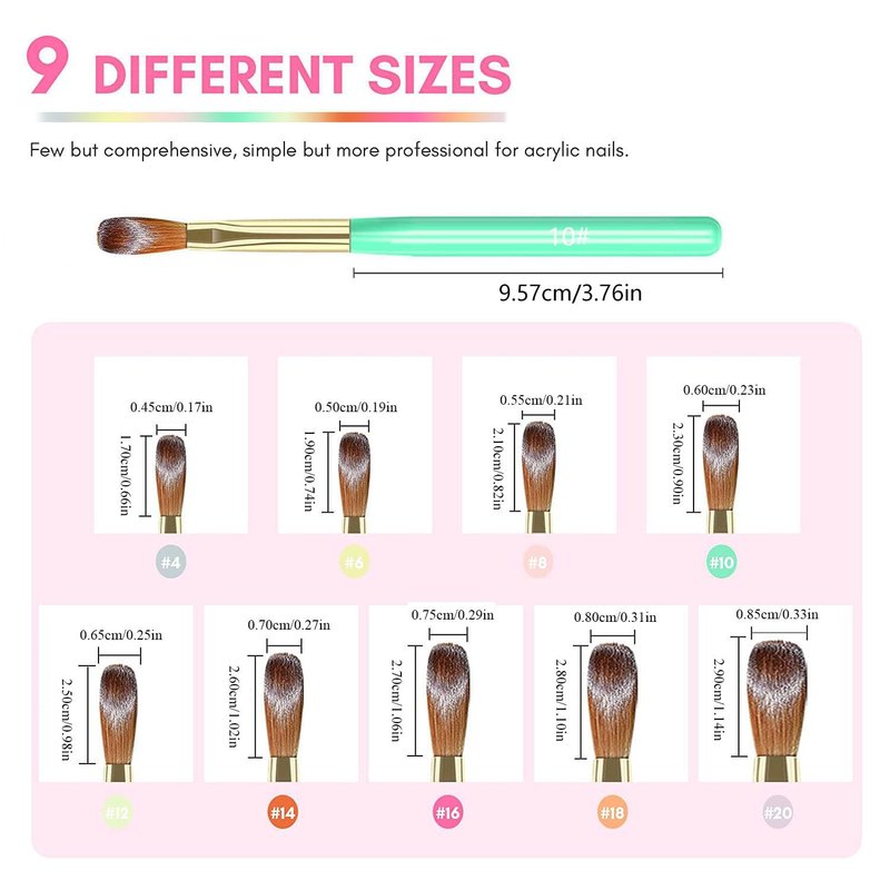 - 🎀 Various Sizes & Vivid Colorful Nail Brush : MAGIC ARMOR acrylic powder brush set has 9 sizes to meet your various nail art needs.Use size 12# 14# 16# 18# 20# acrylic nail brush for nail extension,size 4# 6# 8# 10# acrylic nail brush for nail carving, fine drawing on nail tips.The Nail Brushes Set with different colors for easier identification during use.