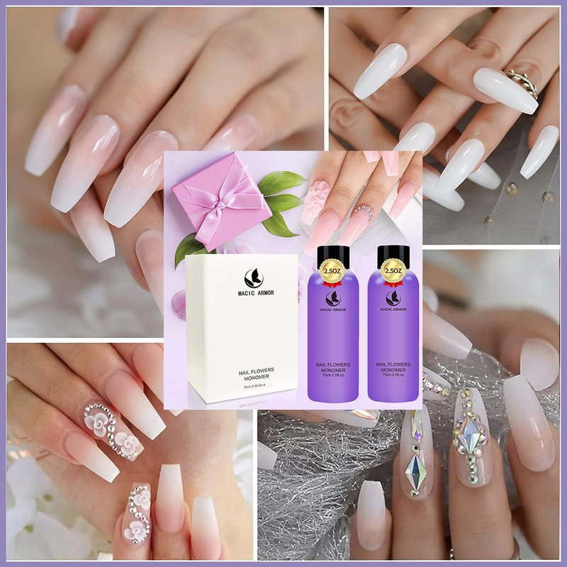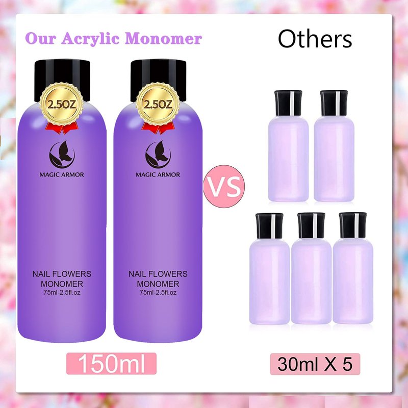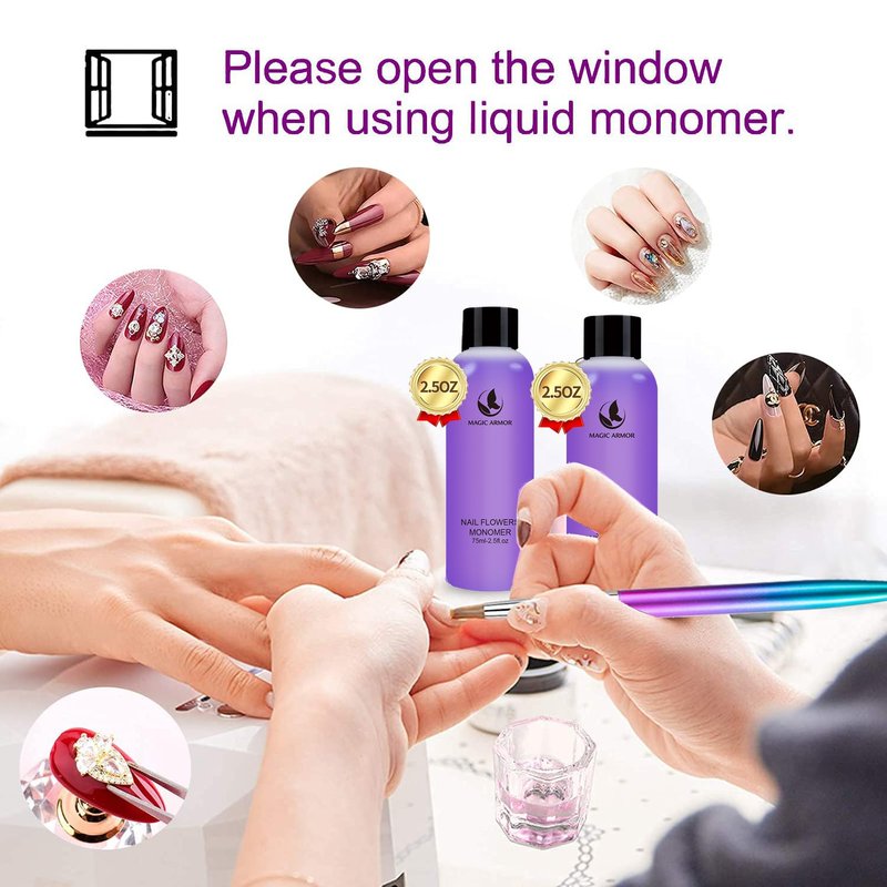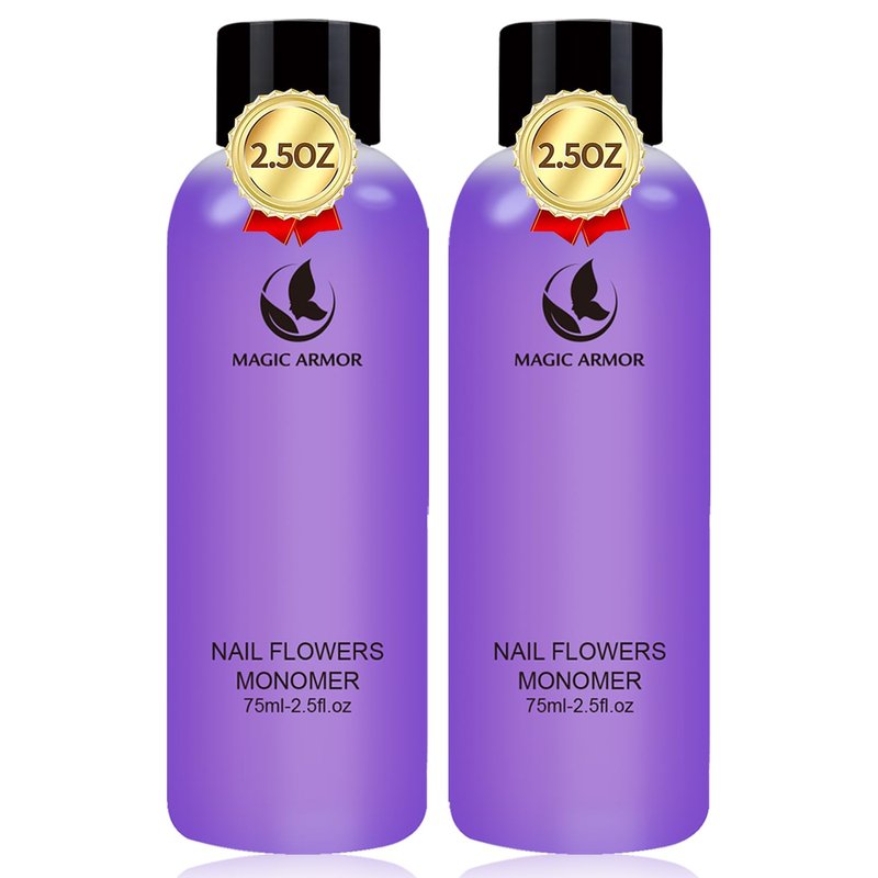 - ❤️ [Professional liquid acrylic monomer] MAGIC ARMOR acrylic liquid monomer kit (2 × 75 ml) is formulated with UV stabilizers to ensure color clarity and prevent yellowing or dulling, a new type of liquid monomer with maximum resistance and non-yellow formula , able to guarantee the best adhesion of the nail acrylic and color transparency is the natural and beautiful smudging effect.