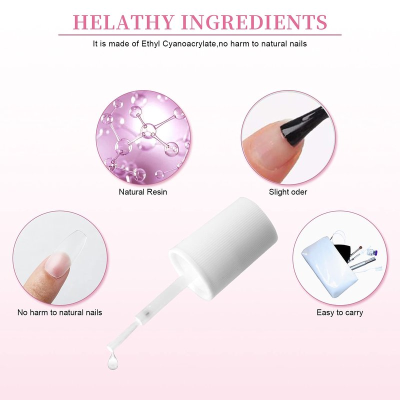 The natural ingredients used in the glue,the light taste can quickly evaporate,will not cause damage to your nails.It has strong adhesion and sticks firmly,so it won't fall easily.