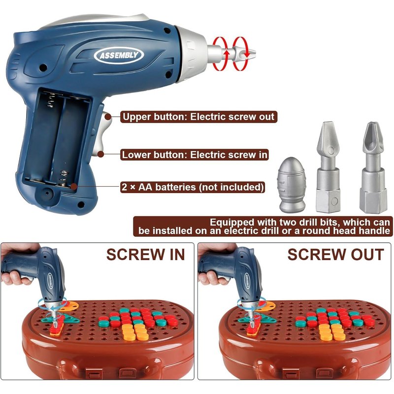 - đ ď¸ăSafe and Durable ConstructionăOur creative mosaic drill set is made of high-quality ABS plastic, the edges are polished. The toy drill is powered by AA batteries (not include), speed is slow, no need to worry about hurting the child.
