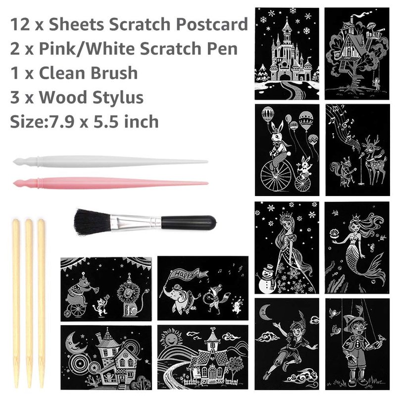 - [ PACKAGE INCLUDING ] : 12 x Sheets Scratch Cards(Princess/ Pinocchio/Castle/Animal), 2 x Scratch Pen, 1x Clean Brush, 3 x Wood Stylus Stick - 7.9 x 5.5 inch