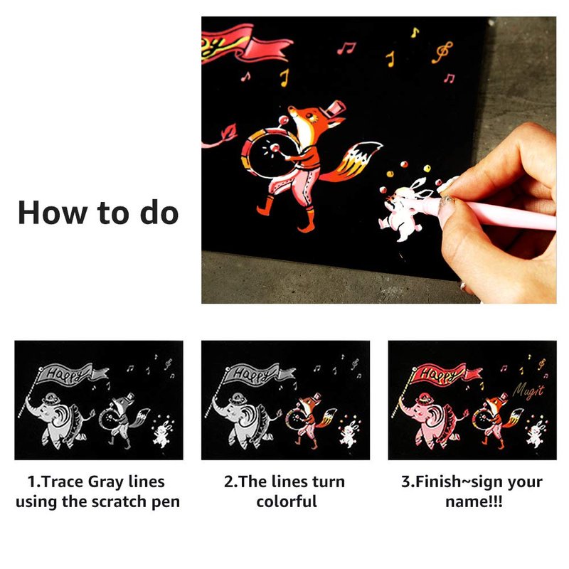 - [ SCRATCH ART RAINBOW ] : Each Scratch Cards features a foil layer of sketches, Use scratch pen (included) to scratch off gray colored sketches, Revealing a beautiful colors underneath, and use a small brush to clean the scraped black powder in time.