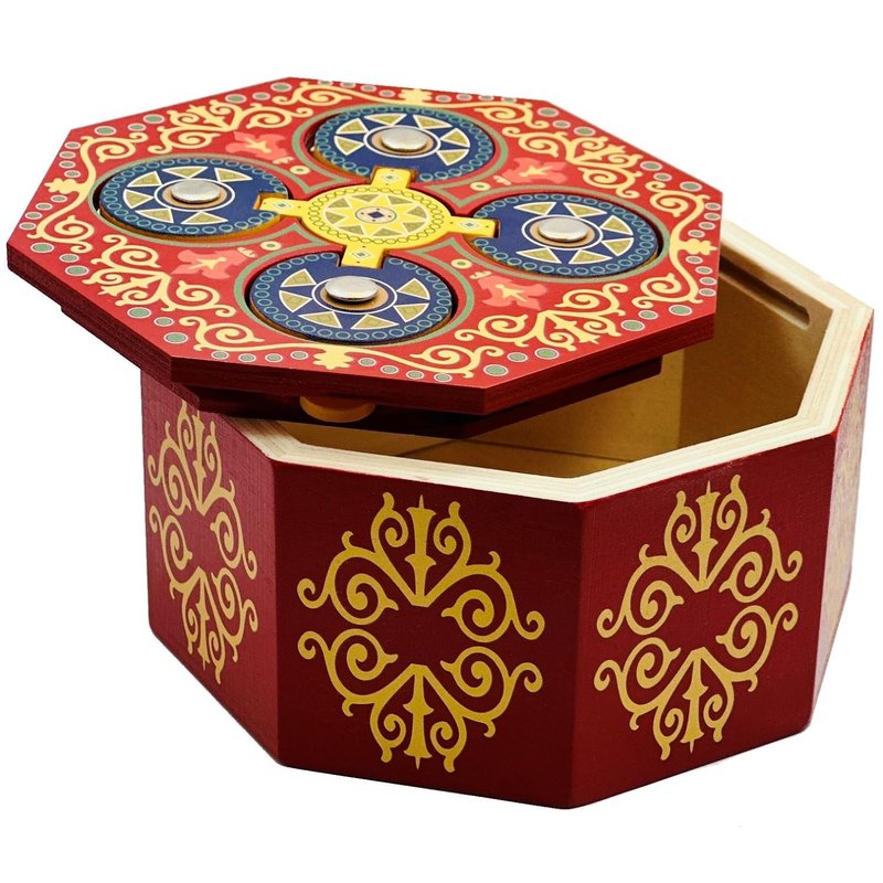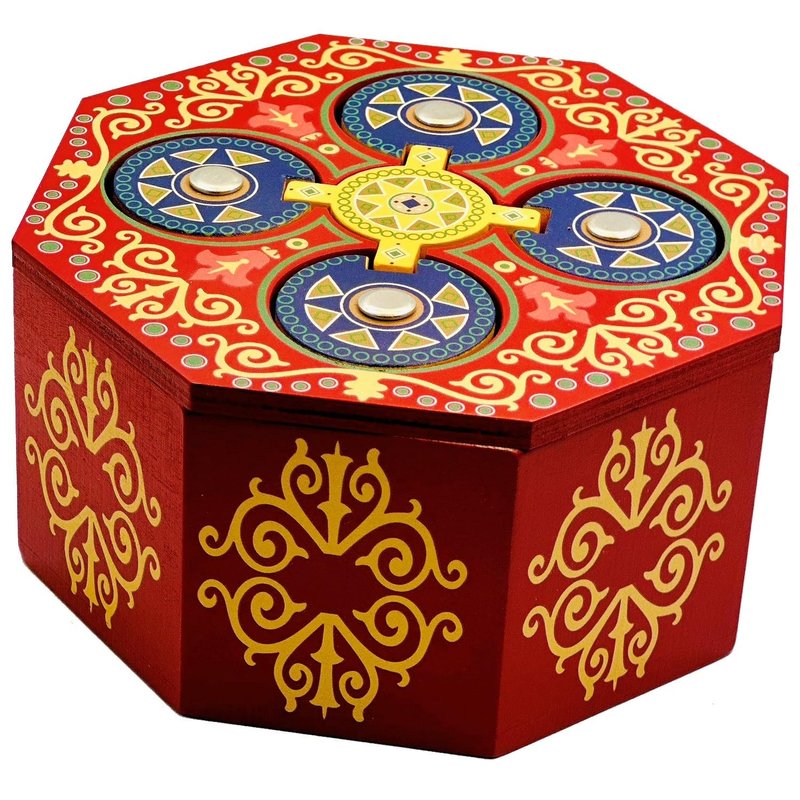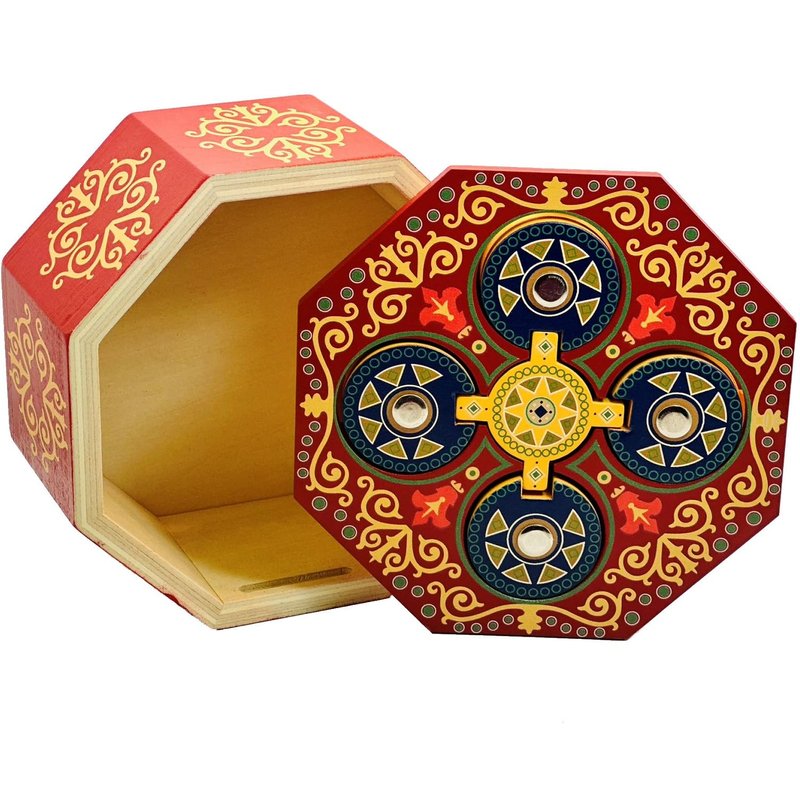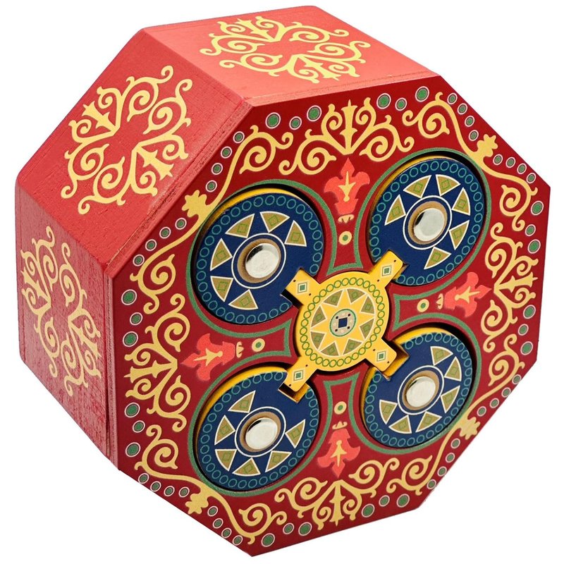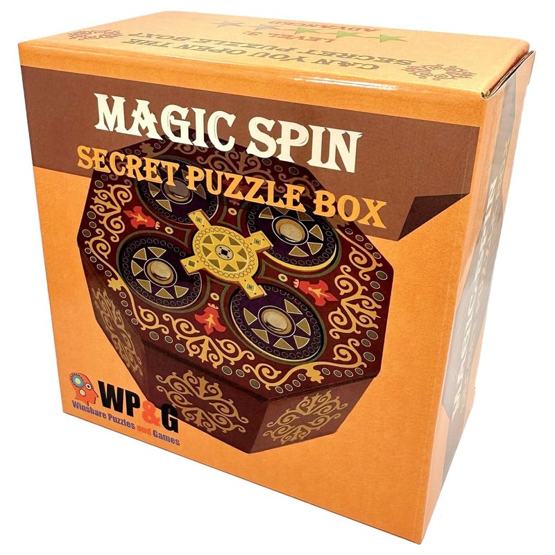 The Magic Spin is a beautiful high quality made puzzle box. Find the way to open this tricky secret box and hide your small valuables inside the large compartment. It is all about the spin. The inner compartments can fit jewelry, gift cards, money or other small valuables that teases the recipient to unlock the surprise within. Solution paper is provided with the box. Made all of wood with high quality printing. Can you solve this secret puzzle and open the Magic Spin puzzle box? Inner compartment size is: 4.25"L x 4.25"W x 1.75"H