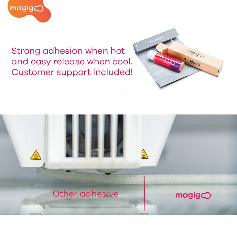 - EASY USE: applying Magigoo is as easy as child's play. Shake, press, apply to an active printing area. Magigoo welds to the 3d build plate bed seamlessly and stops prints from warping. Magigoo adhesive properties are designed to release the 3D print once the build plate has cooled & Magigoo is easily cleaned with water