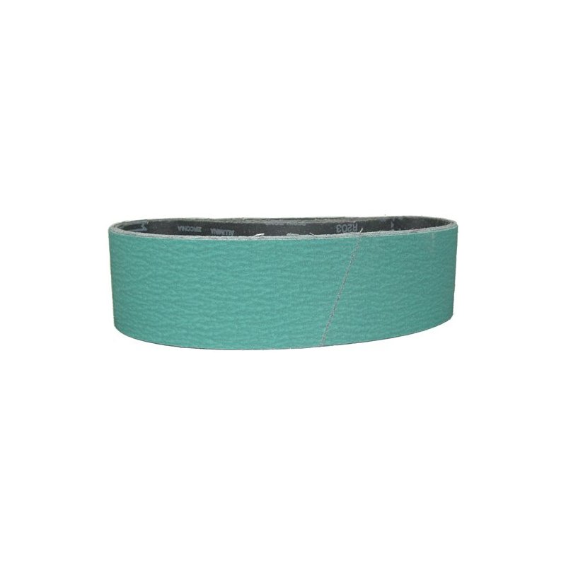 This closed coat zirconia alumina belt uses a heavy "Y" weight resin bond polyester backing with grinding aid for a fast cut in heavy grinding, deburring applications. It is suitable for cast iron, nickel, alloy and stainless steel requiring sharp cutting without heat build-up.. Closed Coat Abrasive Grain Coverage - Abrasive grains cover 100% of the coated surface. The greater number of abrasive grains normally results in a better finish and a higher amount of stock removal during the useful life of the product. If loading is not a problem, a Closed Coat product will give you superior life and lower cost. Closed Coat products are widely used in metalworking and woodworking applications. Resin Bond Backings - Resin bond backings offer greater resistance to heat , are more durable in heavy stock removal applications and provide the best all-around bond system. Zirconia alumina is a man made abrasive and its products are typically in green or blue color. A blocky shape grain has a micro-crystalline structure. Zirconia alumina's self-sharpening characteristic gives good life on heavy stock removal applications, i.e. heavy grinding of metals, planing operations for wood.
