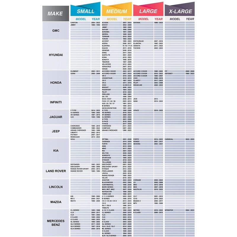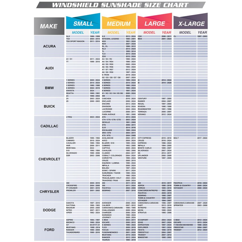 - Available In 5 Sizes; to fit most vehicle makes and models. Find your vehicle in the size chart to determine which windshield cover sun shade suits your pickup truck, van, car or SUV. Each includes a complimentary pouch for storing your folded car shade in the trunk or under a car seat.