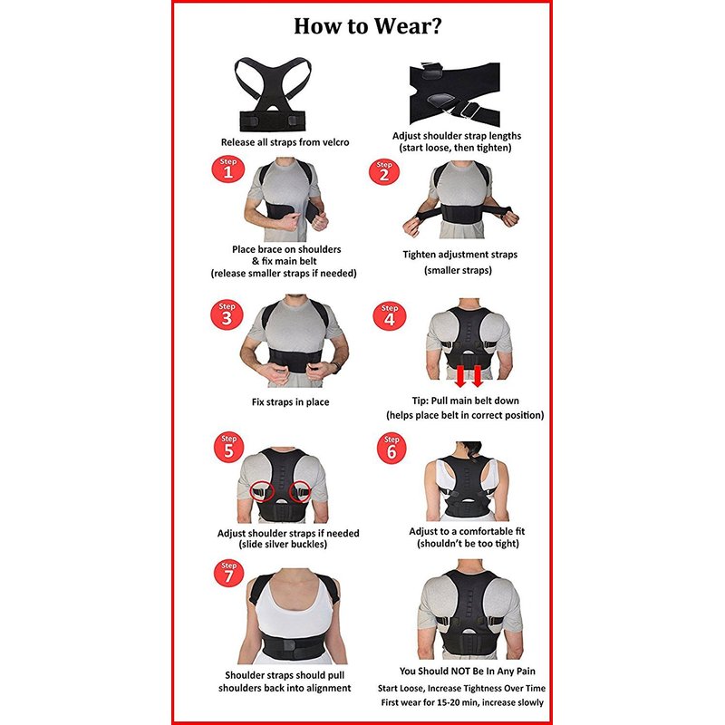 - Easy to wear: You can easily put on the posture corrector by yourself following these steps: First, just put on the posture corrector and adjust the shoulder pads. Second, fasten the waist band comfortably. Third, pull on the elastic back straps and attach the Velcro to the waist belt. Finally, your shoulders and back will feel stretched.