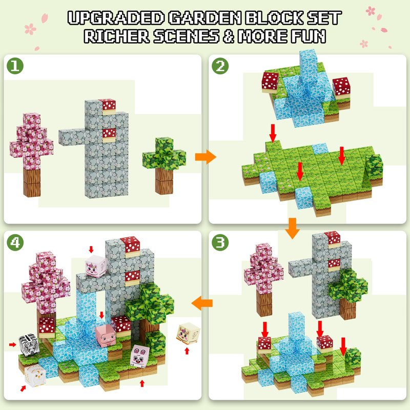 - 【108 MAGNETIC BLOCKS TO BUILD 6 SCENES】2024 Upgraded Magnetic Cube Garden Set with 108 pieces magnetic blocks and 14 block types.A larger number of magnetic blocks provides more creative possibilities.Children can go from building simple cherry blossom trees to challenging garden constructions,bring their pals - unicorns,zebras and other animals-and use their imagination to create a magnetic world of their own.