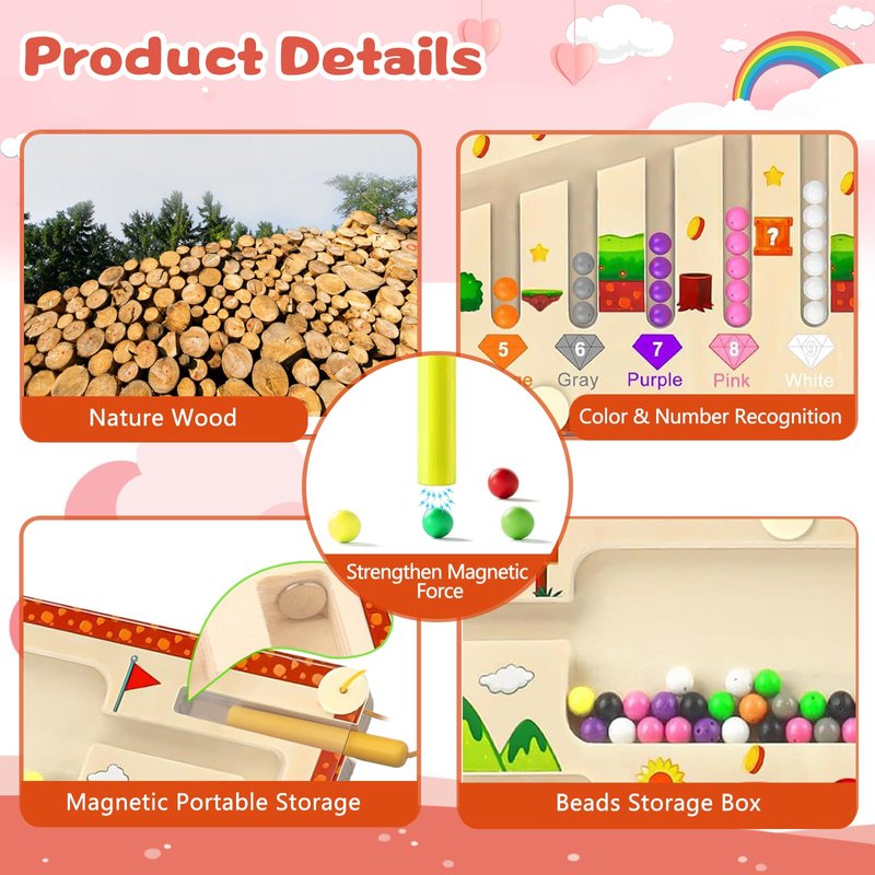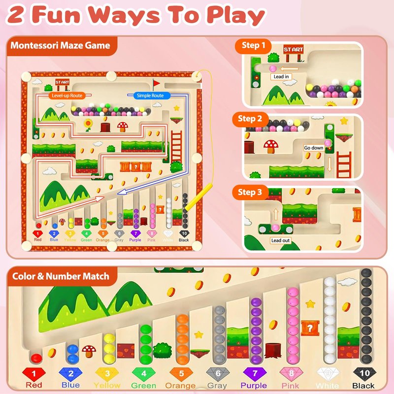 - Fun Montessori Toys: This maze toy has two route options. Children use magnetic rods to move beads through the maze to the corresponding color slots, counting as they go. It can improve children's motor senses, hand-eye coordination, color recognition, counting and matching abilities, and logical thinking abilities