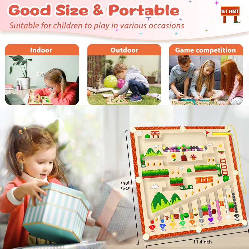 - Magnetic Color and Math Maze: This magnetic toddler game board consists of 55 magnetic beads in 10 different colors and a Magnetic stick. The magnetic beads are fully enclosed in the maze toy, and the magnetic pen is fixed on the toy board so that it will never be lost. The toy has cartoon patterns of different colors to improve children's cognition. Note: Please keep the magnetic pen vertical for better use