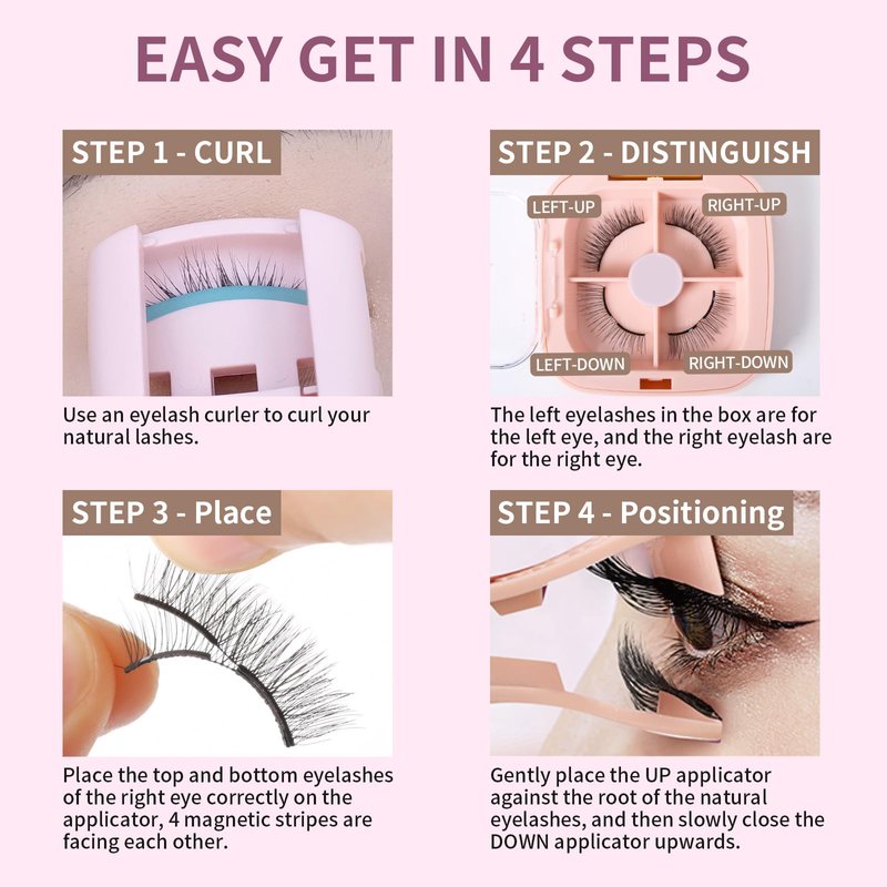 - EASY 4-STEP APPLICATION & 1-STEP REMOVAL: Curl the natural eyelashes; place the magnetic eyelashes correctly on the applicator; place the applicator at the base of the eyelashes, and gently clip to complete the wearing process. Just gently pull off the eyelashes with your hand, without using any remover. Both application and removal of eyelashes are quite simple, making it easy to obtain beautiful eyelashes. Don't you want to have one?