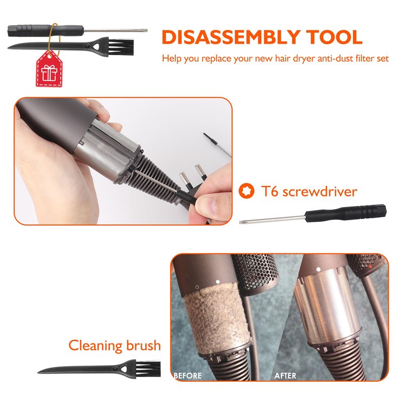 - 🧲[Package List] Hair Dryer Outer Filter * 1; Inner Filter * 1; T6 Screwdriver * 1, Dust Brush * 1. Gift screwdriver for removing and installing the filter inside the hair dryer. The magnetic outer filter can be removed and cleaned at any time, but the built-in filter is not easy to remove down frequently, so just brush off the surface dust with our complimentary cleaning brush.