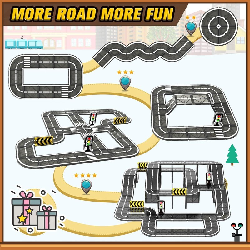 - Educational & Funny:The magnetic tile roads provide kids with a limitless creative play space where they can create tracks, elevated bridges, tunnels, ramps, and more for toy cars, race cars, buses, and other car games. By simulating real traffic scenarios, kids can learn about traffic rules and safety awareness. This hands-on learning approach helps them better understand and apply the knowledge they acquire, making magnetic tile roads a valuable educational tool that in classroom must haves.