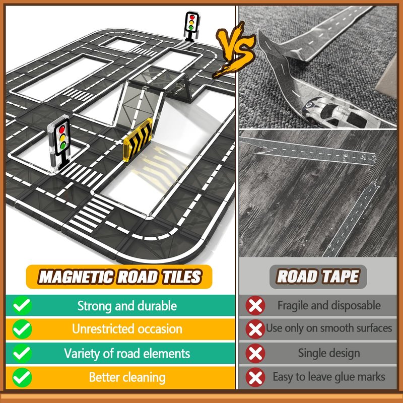 - Much Loved Magnetic Tiles Road:This is the magnetic tiles road set that kids have been eagerly waiting for, which can be used as a supplementary pack to connect with your existing magnetic building blocks. The magnetic road tiles set consists of 20 road tiles, 2 traffic lights, and 2 traffic signs. It is a set that only includes road elements, so you don't have to worry about other accessories that you don't want. Add the magnet tiles road set to your toy collection and let kids continuously explore new road designs and architectural plans, keeping their interest and creativity alive.