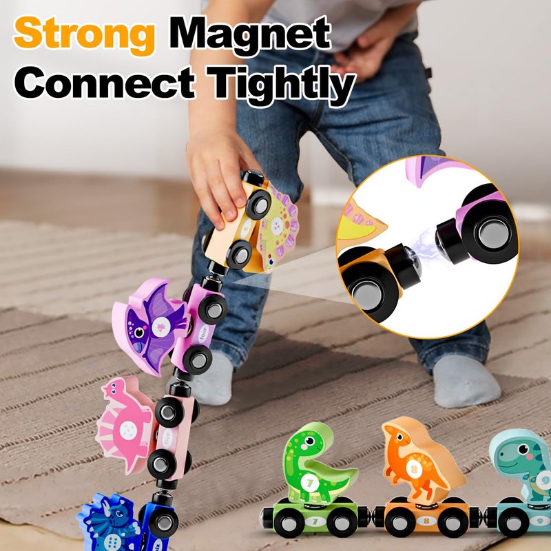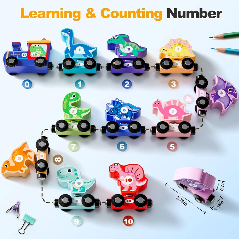 - [NEW Magnetic Dinosaur Train Set] - Our wooden magnetic train set includes an engine and 10 dinosaur train cars, featuring numbers 0 to 10 printed on train cars with matching numbers. This upgraded version offers new matching games that help kids learn numbers, shapes, and colors, perfect toys for 3 year old boys who love dinosaurs and trains!