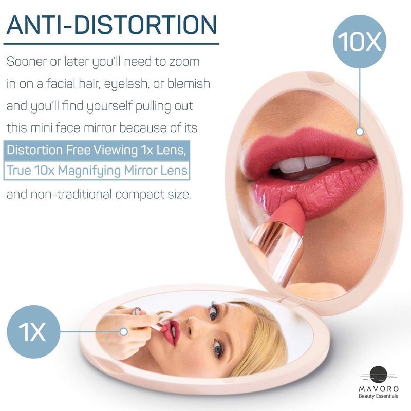- ANTI-DISTORTION 1X AND 10X: Sooner or later you’ll need to zoom in on a facial hair, eyelash, or blemish and you’ll find yourself pulling out this mini face mirror because of its Distortion Free Viewing 1x Lens, True 10x Magnifying Mirror Lens and non-traditional compact size. Imperfect Vision Friendly!