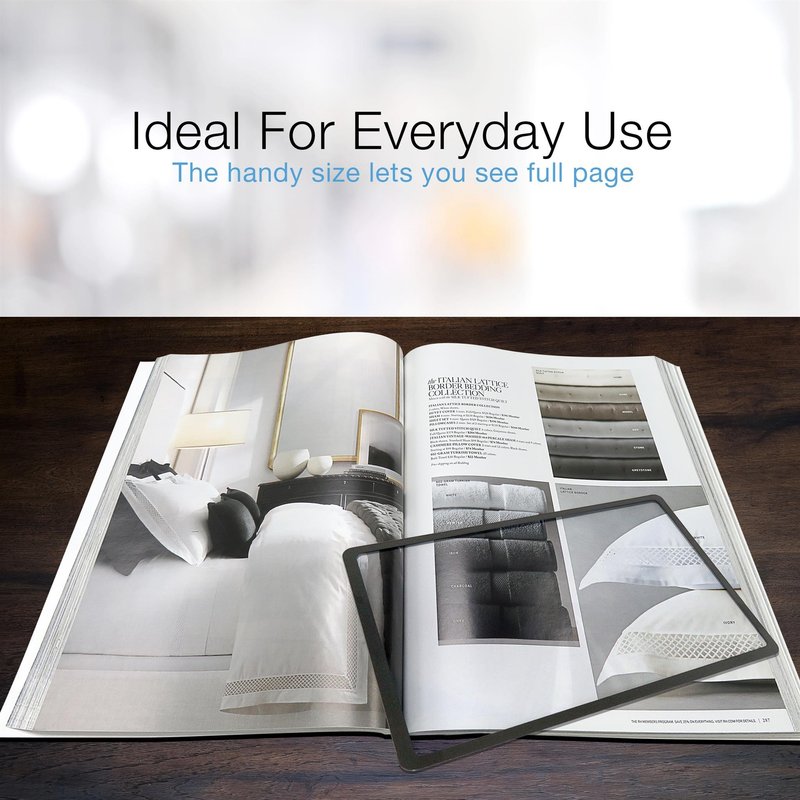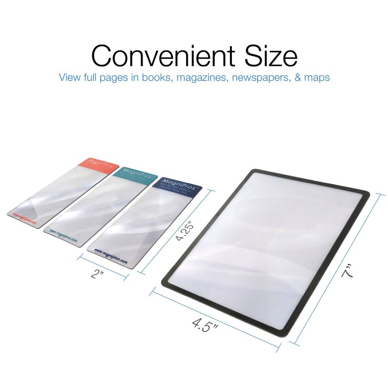 The magnifying sheet is ideal for reading small print on maps, instructions or books and has the ability to magnify full pages, Handy 4.5inch x 7inch size lets you see full page for books, magazines, newspapers and maps.