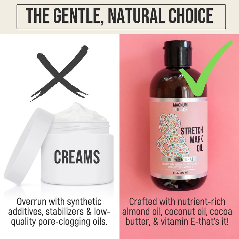 - BELLY OIL > BELLY CREAM: many stretch mark creams contain synthetic additives to keep them shelf-stable. Luckily, your belly oil is 100% natural, making it ideal for pregnant women and those with sensitive skin looking to keep things natural.