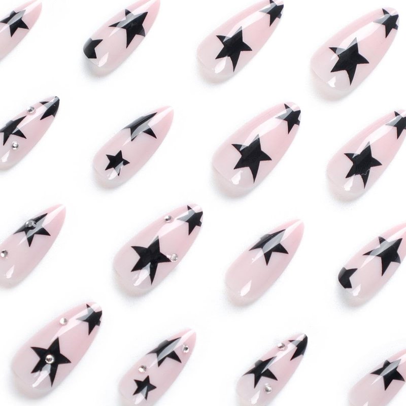 Maigitur Black Star Press on Nails Medium Almond Fake Nails with Design Rhinestone Stick on Nails Acrylic Nails Star False Nails Glossy Natural Nude Glue on Nails for Women Girls Manicure 24Pcs