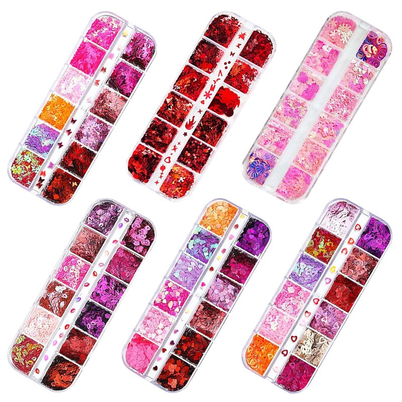 MAIOUSU STORE 72 Grids Valentine's Day Nail Art 3D Pink Red Holographic Nail Sequins Lazer Butterfly Star Moon Flakes Glitter Heart Hollow Heart Lip Shape Laser Flakes Sparkly Confetti