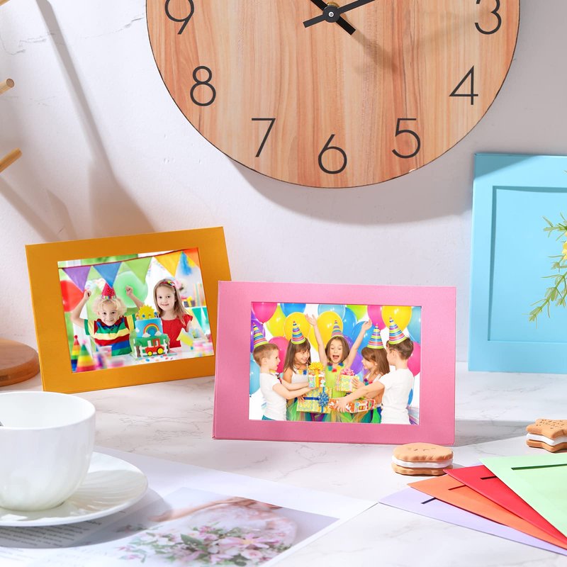 Features: Tabletop display items: Our kid artwork picture frames are designed with easel stands, so that they can stand stably on a table, shelf, mantel, desk, etc., then easily present beautiful appearances and decorate your photos, while letting warm memories surround your home. Suitable for crafts: Decorate the colorful picture frames however you like for an upcoming wedding, baby shower, birthday party or just for fun. By the way, creating crafts with your wish and personality to give to a friend or family member will bring you closer together. Specifications: Main material: cardboard paperMain color: red, orange, light yellow, dark yellow, light green, dark green, light blue, dark blue, pink and purpleSize: Inner frame: approx. 3.5 x 5 inches (fits approx. 4 x 6 inches photos)Outer frame: approx. 4.7 x 7 inchesPackage includes: 100 x Paper picture framesNotes: Manual measurement, please allow slight errors on size. The color may exist a slight difference due to different screen displays. Please confirm the size of your photo before purchase.