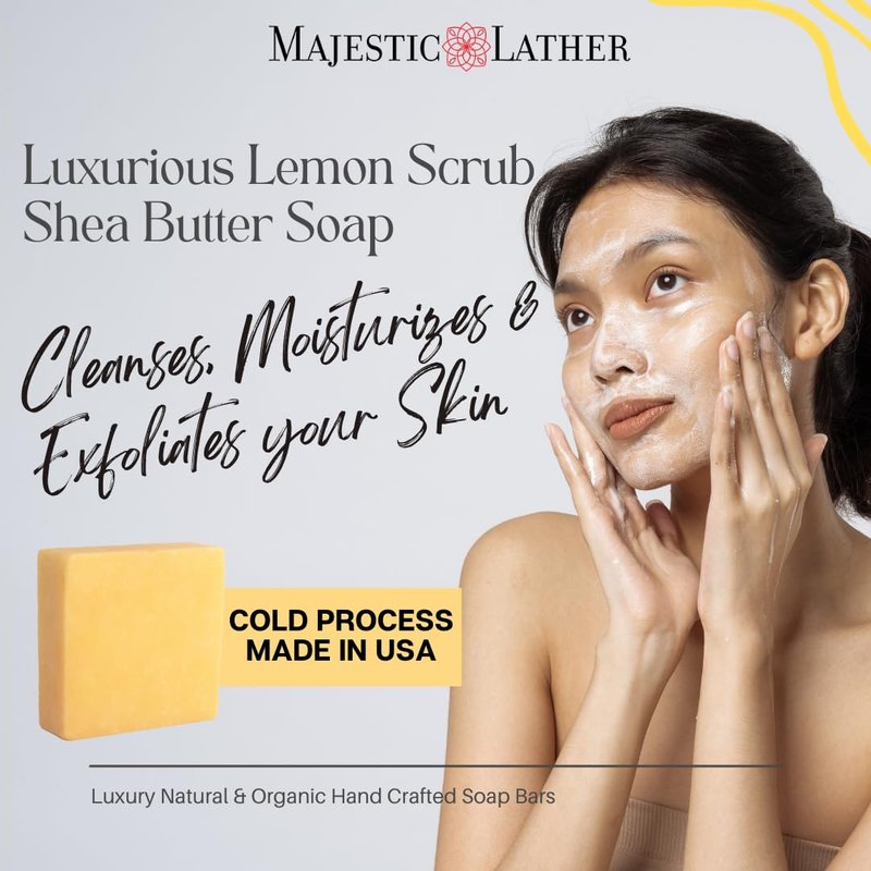 Majestic Lather Lemon Luxury Handmade Bar Soap for Face & Body - Gentle Cleansing & Exfoliating. Moisturizing & Nourishing - Shea Butter & Natural Oils. Cold Process. For All Skin Types