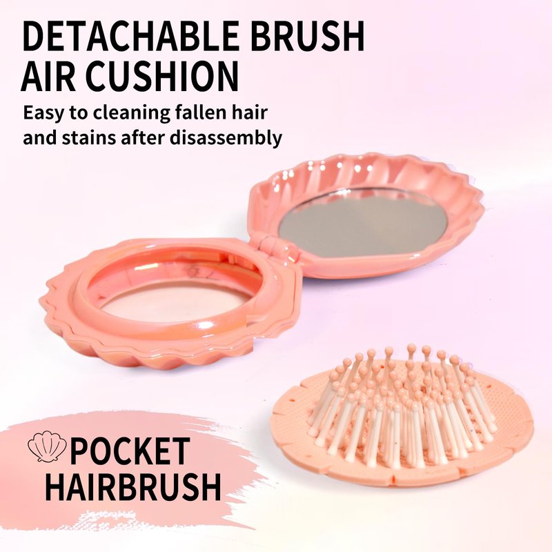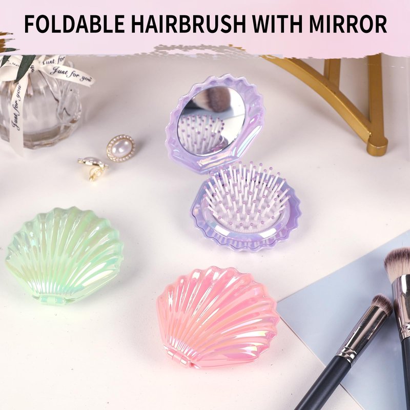 - PERFECT DESIGN:This foldable hairbrush with mirror is designed as a beautiful shell shaped appearance,and its surface has been treated with illusion electroplating craft, makes it has a shiny finish with anti-scratch effect.The moment you got it, you will be amazed by its excellent design.
