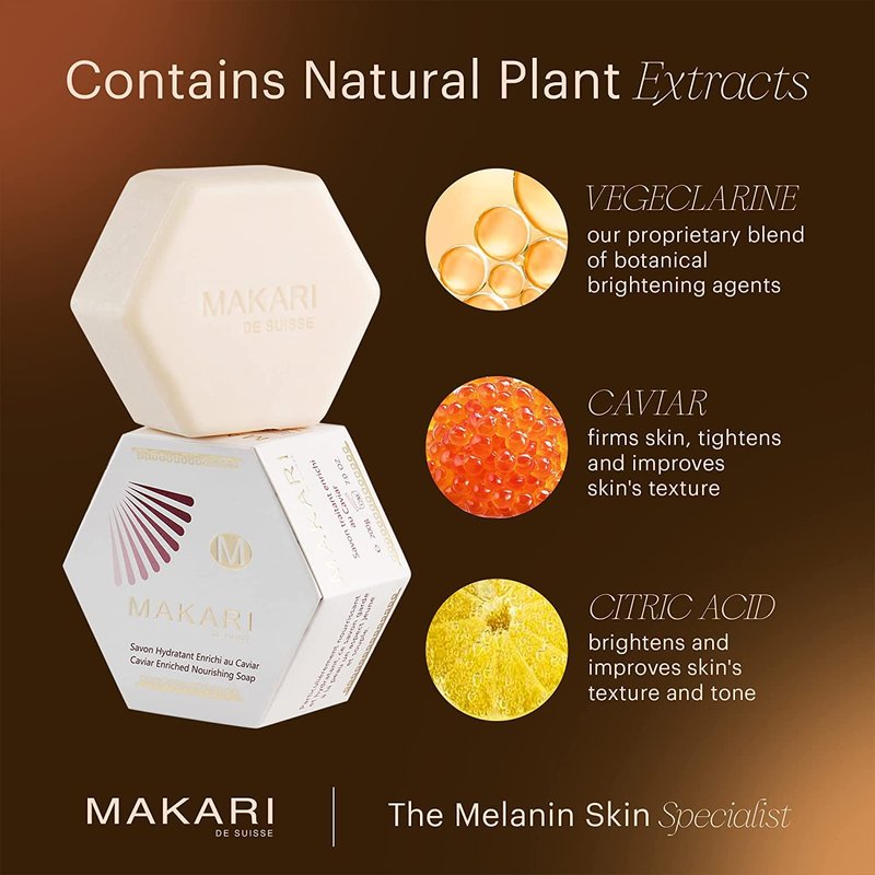 SKIN BRIGHTENING MOISTURIZER Reveal an even and radiant skin with Makari Classic Caviar Enriched Treatment Soap. Our rejuvenating cleanser promotes complexion uniformity and moisturized skin. It aids in maintaining an even skin tone on your face. It also works on strongly pigmented skin areas to aid in treating dark spots, blemishes, and age spots on your body. It is specially infused with intense hydrating marine extracts and age-defying nutrients that soothe, soften, and brighten dull and flaky skin. NATURAL ANTI-AGING FORMULA Our moisture-boosting bar is formulated with protein-rich ingredients. It contains naturally-based vegeclairine, a non-chemical proprietary blend of skin brightening ingredients that works to brighten skin pigmentation. Our anti-aging soap also contains Caviar and Citric Acid that helps refine the appearance of pores, fights wrinkles, and instantly illuminates dry and ashy skin from within. It is specially created without chemicals or bleach for a safe skincare routine. CLASSIC SKIN CARE REGIMEN Make our brightening cleanser a part of your daily skincare routine to achieve a more even skin tone. Use our anti-aging bar soap twice daily, in the morning and night. For best results, massage the soap suds gently on your face, neck, and body in circular motions and then rinse thoroughly. With regular use, you can get a more balanced skin complexion and a smoother skin texture with our ultra-moisturizing facial bar. Our hydrating cleanser works to intensely moisturize your skin while it helps cleanse away dirt, makeup, and impurities to reveal a bright, youthful, and even appearance. Our luxurious cleanser features a non-drying finish, perfect for dry, normal, and maturing skin types. Use routinely with Makari’s complete line of Classic brightening products to achieve your ideal shade of beautiful! Get your Makari Classic Caviar Enriched Treatment Soap today and start enjoying smoother and more balanced skin.