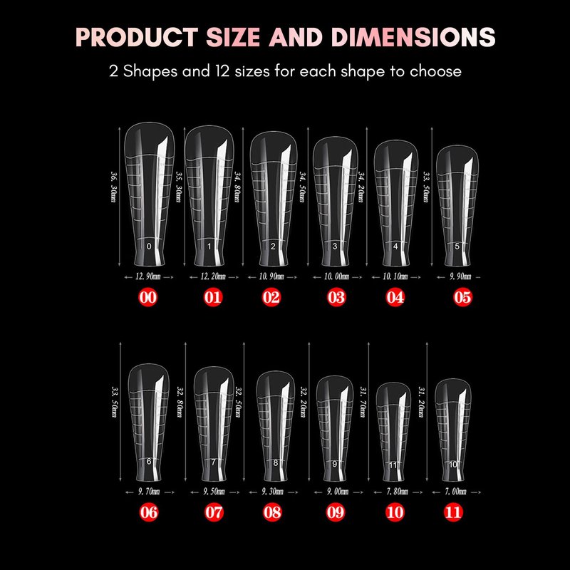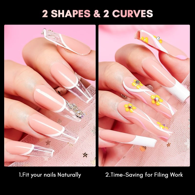 - [Square and Coffin Shaped Nail Molds]-The dual forms tools set comes in 2 shapes and 2 curves. The coffin shape and the square nail shape. The pre-shaped coffin nail tips save you time shaping gel nails into coffin nails, stiletto nails, almond nails, or other similar tapered nails. And the 2 different curve are more fitting to your natural nails, and make you feel more comfortable.