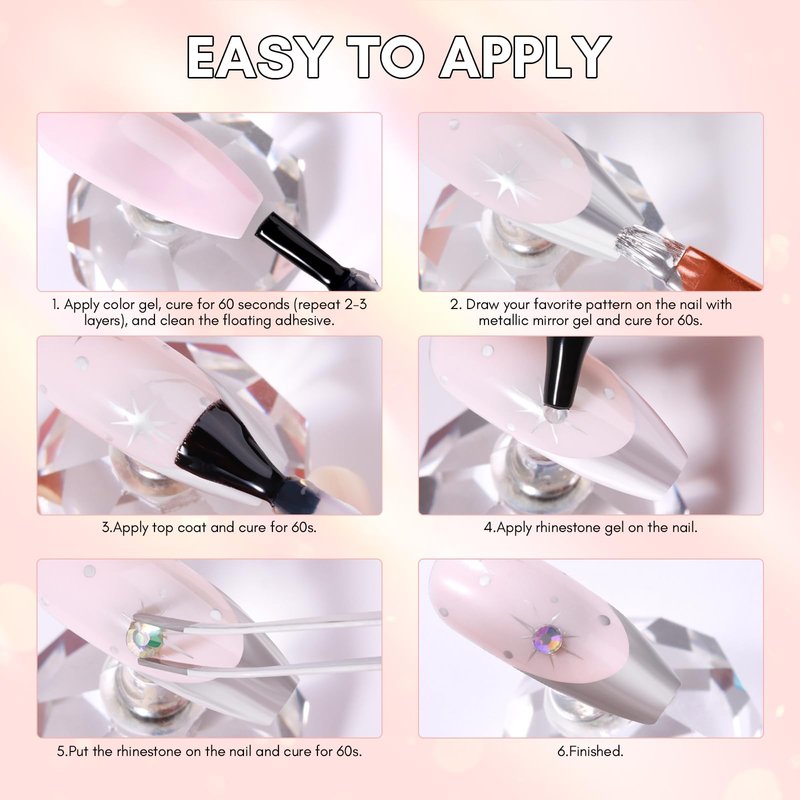 - EASY TO USE - The glue nail is convenient for use with tube design, easily to squeeze out as much as you need for nail art bling design, no mess! No spilling at all! Draw the pattern you want with mirror adhesive, apply a top coat, squeeze on nail adhesive glue, and place the diamonds on the squeezed adhesive diamond glue to cure.