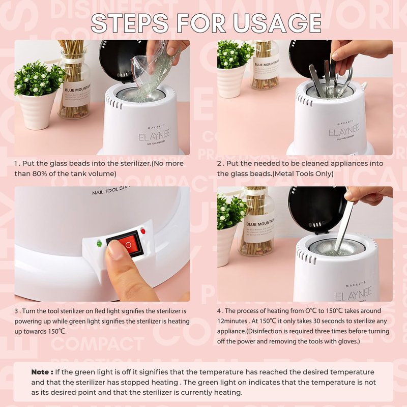 - Easy To Use-The intelligent nails sterilizer can automatically increase to and maintain 150 degree(302°F) high temperature when you plug in the power, put the glass ball into the inner pot and turn on switch, which keep the tools clean and sterilize. Protect the wellness of your customers and family by keeping metal tools clean regularly.