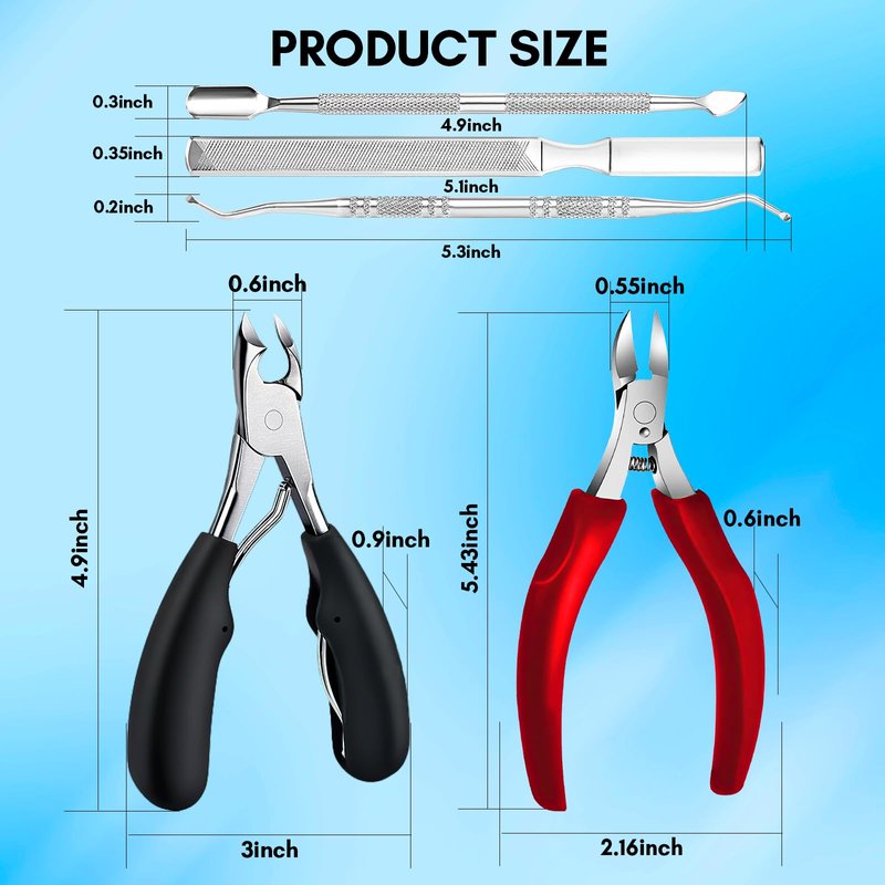 Package Includes:1*Wide Jaw Opening Nail Clipper, 1*Podiatrist Toenail Clippers, 1* Metal Nail File, 1*Nail Cuticle Cutters,1*Toenail Lifter
