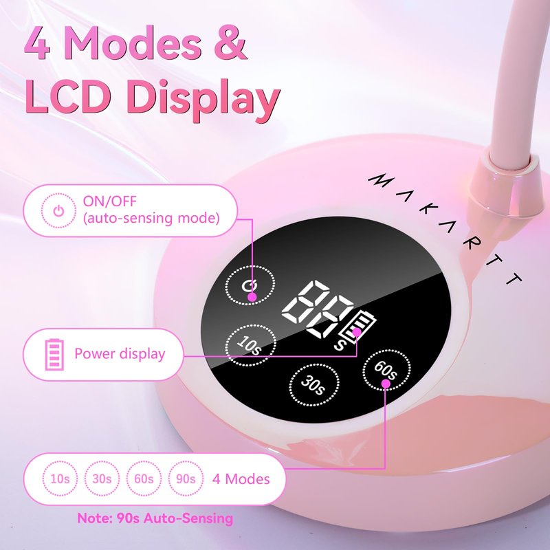 - 【4 Timer Settings & LCD Touch Buttons】 This nail curing lamp offers four timer options: 90 seconds (default timer on standby, auto-sensing), 60 seconds, 30 seconds, and 10 seconds. A gentle touch activates the lamp and allows you to select the desired timer, while the built-in LCD screen clearly displays battery capacity and timer status.