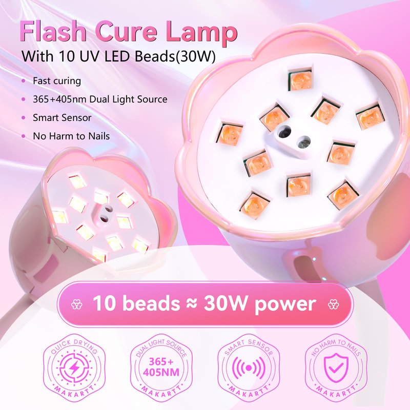Makartt cordless nail lamp features an 1800mAh rechargeable battery and 10 UV+LED dual light source beads, effectively shortening curing times. It can cure all types of nail gels in just 60 seconds (stay within 5cm). Curing times vary by gel type: 10 seconds for false nails, 60 seconds for gel polish, 120 seconds for extension gel, and 60 seconds for nail rhinestone glue.