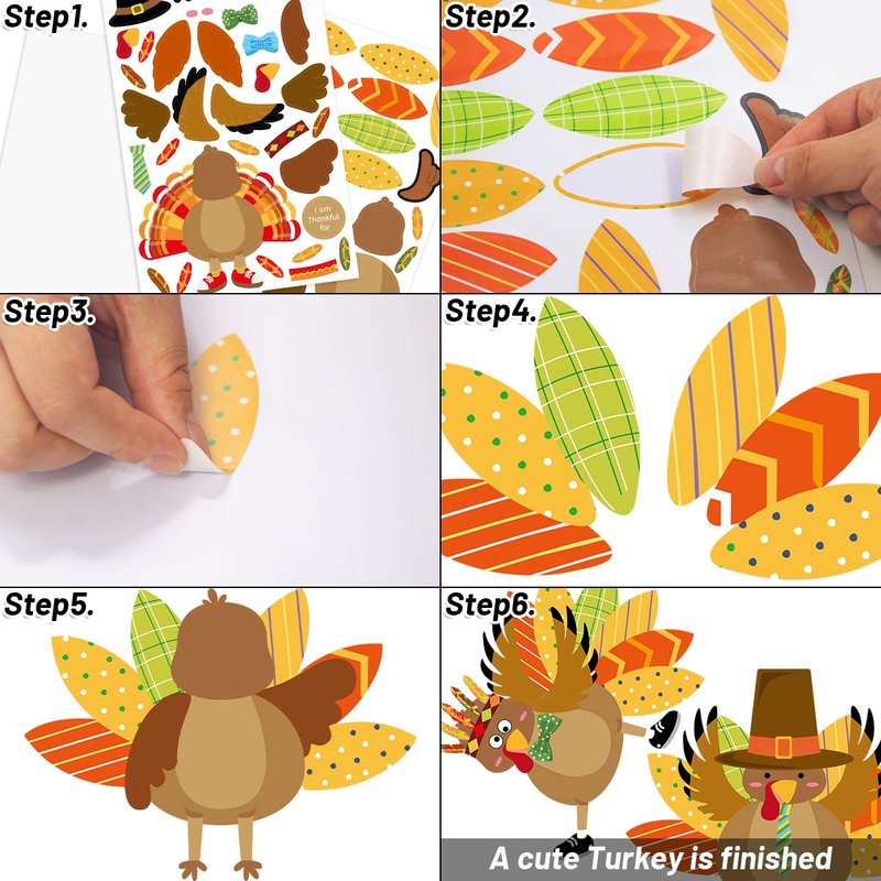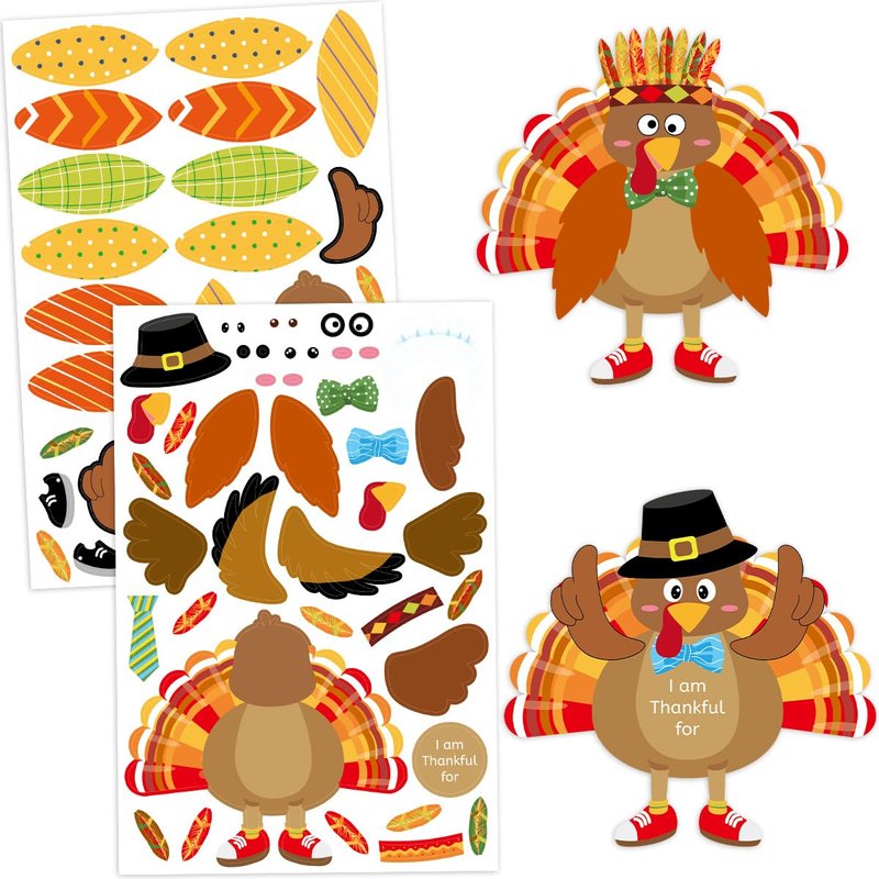 - Package Includes: 20 Make-A-Turkey sticker sheets. 2 designs, 10 of each. All the stickers are repositionable