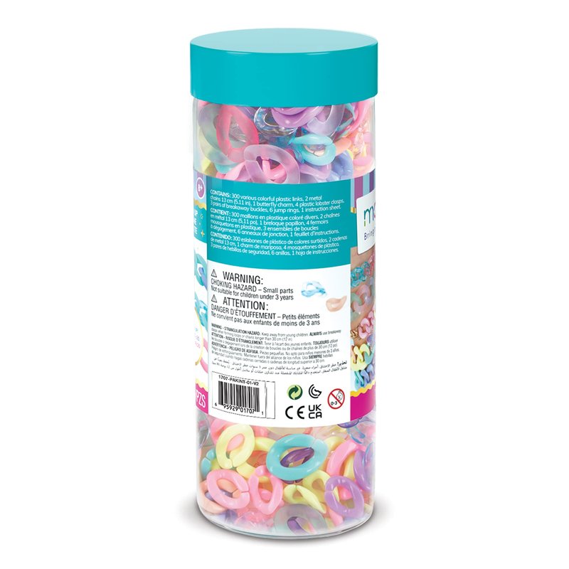 Link 'em up! A jar full of possibility where fabulous fashion awaits. Interlocking and interchangeable fashion links waiting for a young designer to bring them to life. Over 300 pieces of frosted, translucent, and opaque plastic links in 2 different sizes included. Different types of claps and decorative curb chain included to accent your own creation. Use the included inspiration instructions to create bracelets and necklaces at the height of fashion or go off script and make a belt, mask holder, strap for a handbag or wristlet; the possibilities are only limited by the builder’s imagination! Ages 6+. Includes:300 various colorful plastic links2 metal chains 13 cm (5.11 in)1 butterfly charm4 plastic lobster clasps3 pairs of breakaway buckles6 jump rings1 instruction sheet Downloads:Instructions