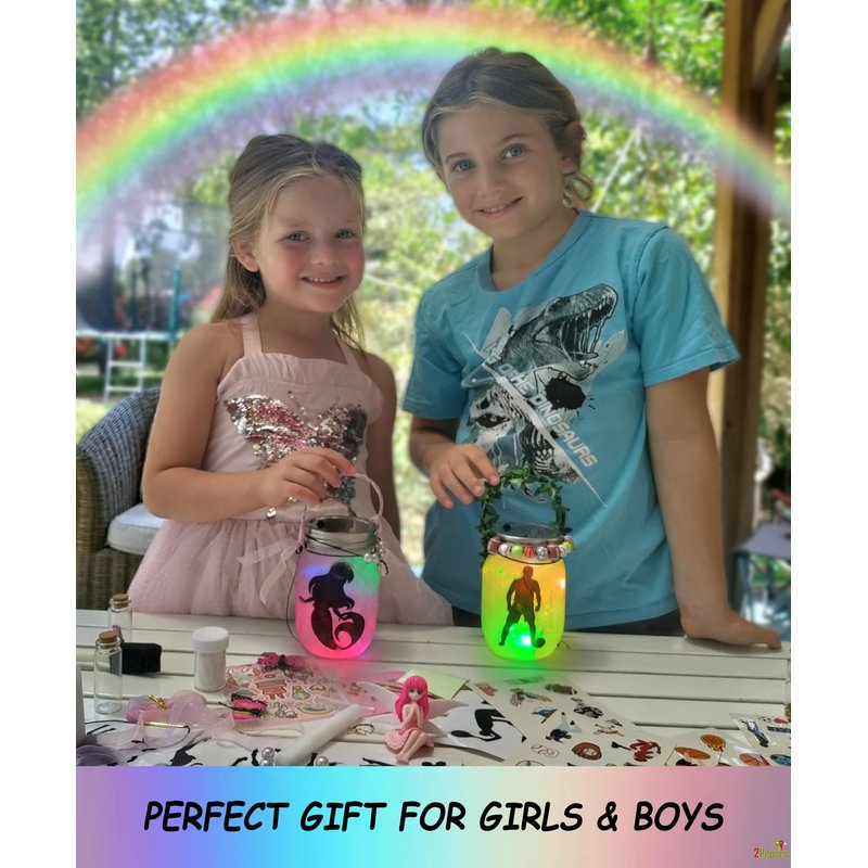 - EASY TO MAKE: our most popular kids crafts kit includes all the necessary craft supplies- 1 plastic jar with handle, metal lid with colorful LED lights, mermaid figure, wishing bottle with a note, gold stars, magical wand, butterfly, glitter, glue, sponge brush, black cord pearls, mermaid lid decoration, glowing in the dark stars, mermaid stickers, ribbons and lots of silhouettes.