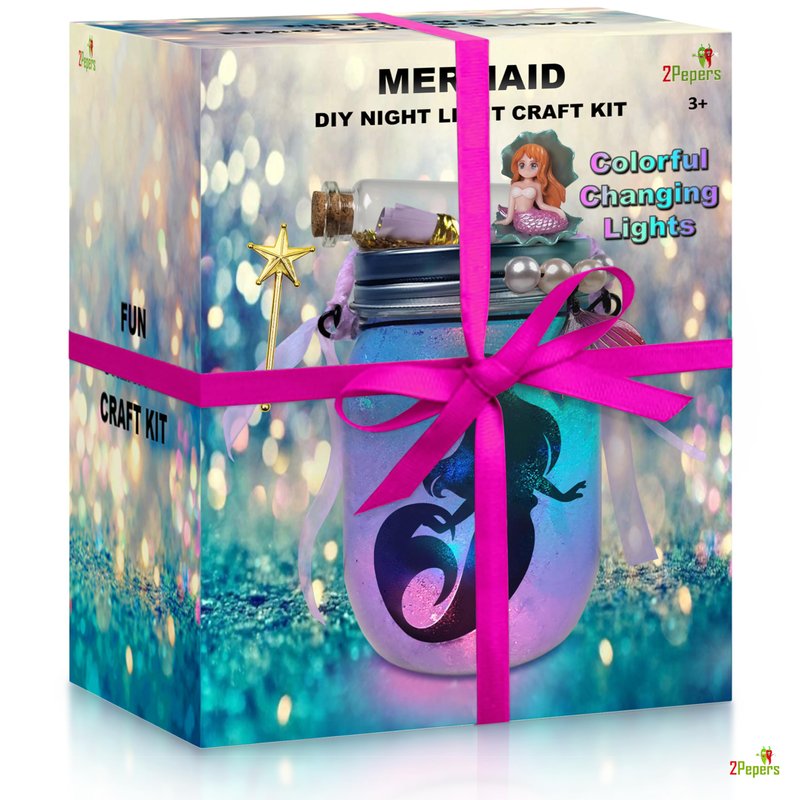 HANDS-ON CRAFTS This craft kit has it all! Perfect combination of craft set & mermaid toys for girls. DIY nightlight project that girls can decorate on their own. Stunning, special and more exciting than any other toy! A PERFECT GIFT RECOMMENDED FOR ANY OCCASION Are you trying to find a fun unique art for girls age 4 years and up? Let us help you! 2Pepers DIY mermaid night light craft is exactly what you're looking for. Great as a Birthday gift, Christmas gift, craft for girls, teens gift, top presents for boys and girls, Easter gift, Valentine's Day gift for kids etc. Includes an impressive packaging and a well-written instruction manual. A COMPLETE KIDS CRAFT KIT What's in the box? Plastic jar with handle & metal lid containing colorful LED lights. Mermaid toy figure & mermaid tail jar décor. Magical wand & butterfly. Wishing bottle with a note and golden stars decoration. Many silhouettes to choose from. Glitter, glue & Brush. Black cord, pearls & colorful ribbons. Glowing in the dark stars stickers and mermaid stickers. Gift packaging and step-by-step instructions. THE ULTIMATE FUN GIRL TOY Develops creativity and imagination. Easy to make. Includes all the necessary craft supplies. Various design options.