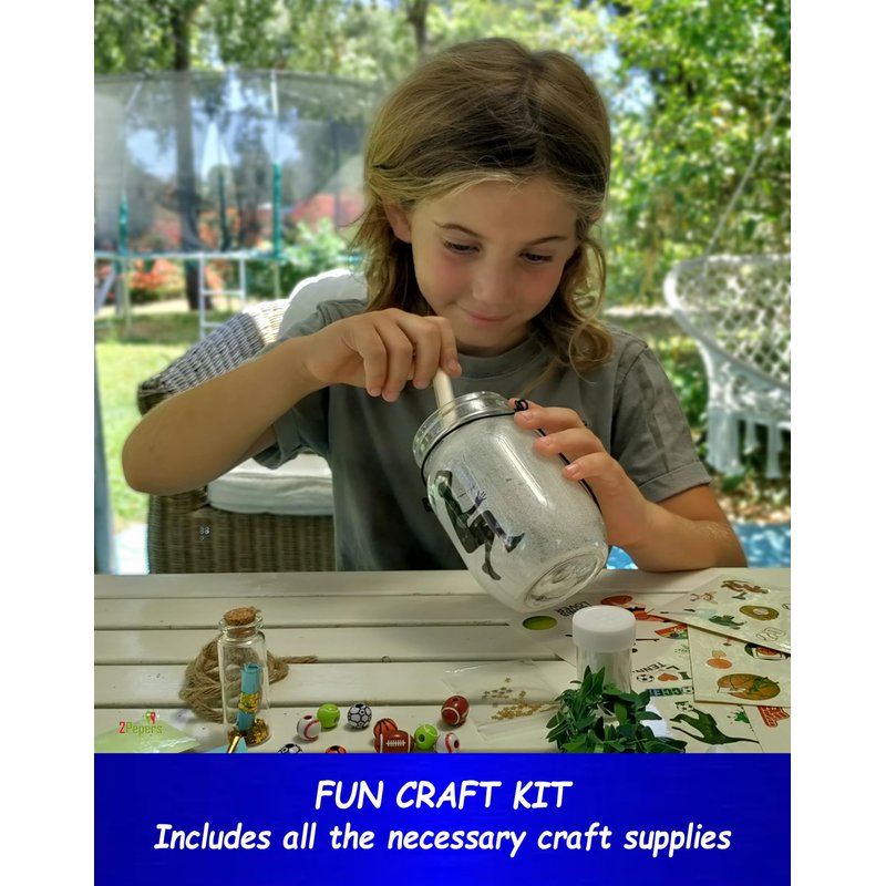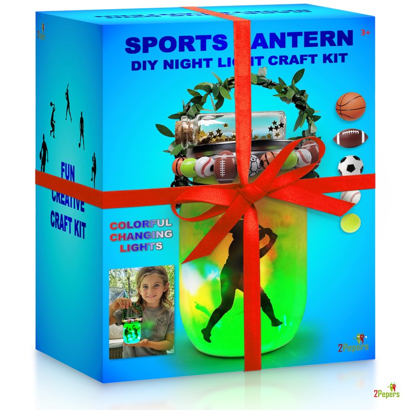 HANDS-ON CRAFTS This craft kit has it all! Perfect combination of craft set & sport toys for kids. DIY nightlight project that boys and girls can decorate on their own-Soccer, Basketball, Football, Tennis & Baseball. Stunning, special and more exciting than any other toy! A PERFECT GIFT RECOMMENDED FOR ANY OCCASION Are you trying to find a fun unique art for boys age 3 years and up? Let us help you! 2Pepers DIY sports craft is exactly what you're looking for. Great as a Birthday gift, Christmas gift, craft for girls, teens gift, top presents for boys and girls, Easter gift, Valentine's Day gift for kids etc. Includes an impressive packaging and a well-written instruction manual. A COMPLETE ART KIT & SPECIAL GIFT FOR BOYS What's in the box? Plastic jar with handle & metal lid containing colorful LED lights. Sport beads- Football, Soccer, Basketball, Tennis & Baseball. Leaves cord & black cord. Wishing bottle with a note and golden stars decoration. Many silhouettes to choose from. Glitter, glue & Brush. Glowing in the dark stars stickers and sports stickers. Gift packaging and step-by-step instructions. THE ULTIMATE FUN BOY'S TOY Develops creativity and imagination. Easy to make. Includes all the necessary craft supplies. Various design options.