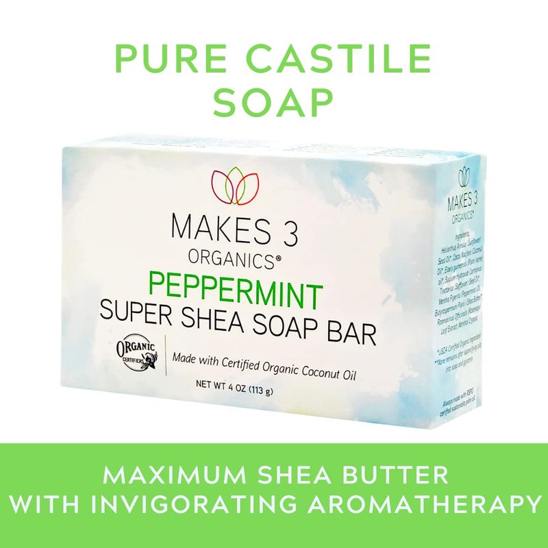 Makes 3 Organics Peppermint Shea Butter bar Soap, Peppermint, 4 Oz