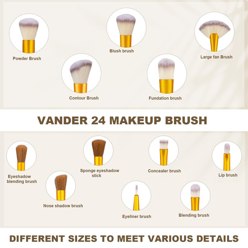 - MAKEUP BRUSHES SET PROFESSIONAL: VANDER professional makeup brush set, featuring 7 craft face brushes and 10 precision eye makeup brushes, complemented by 7 versatile Small Concealer Brush, Lip Brush, Nose Contour, Eyelash Brush, Small Fan Brush, designed for professional and makeup enthusiasts, this makeup brush kit empowers you to achieve expert-level makeup applications effortlessly.