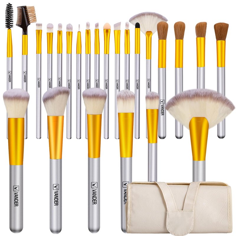 Makeup Brush Set, VANDER 24pcs Premium Synthetic Makeup Brushes for Foundation, Professional Eyeshadow, Eyeliner, Concealer Make up Brush Kit with Leather Travel Makeup bag, Champagne
