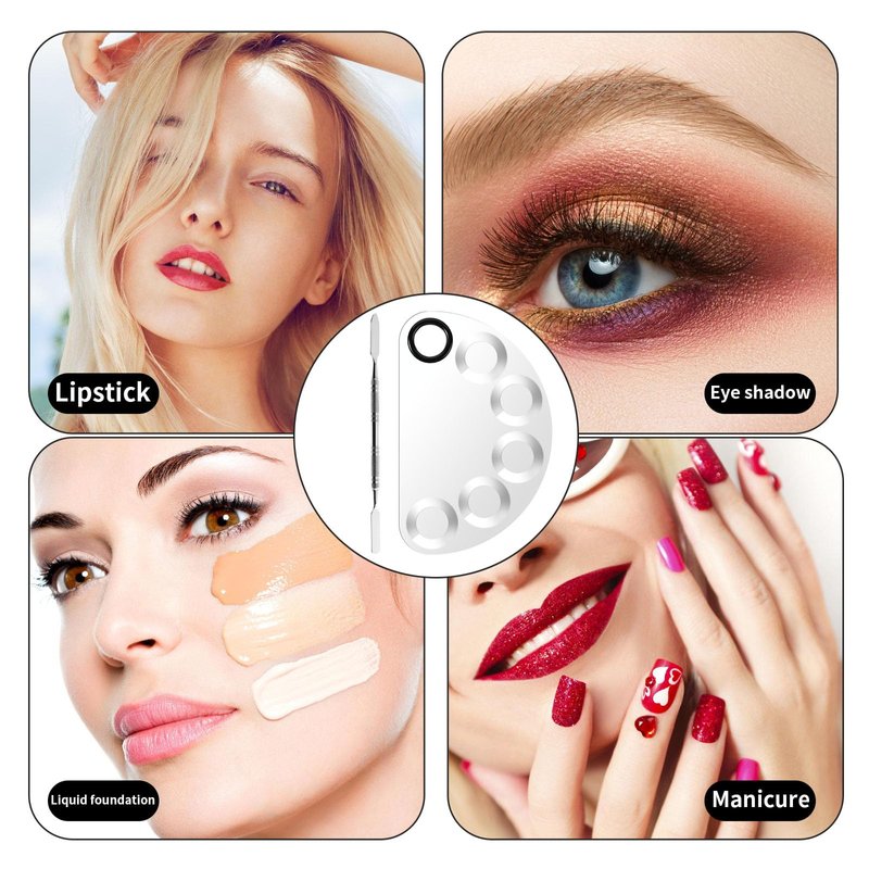 - Package Contents: The makeup palettes set contains 1PC stainless steel foundation palette(5-wells fan shaped makeup palette tray) and 1PC stainless steel makeup spatula.