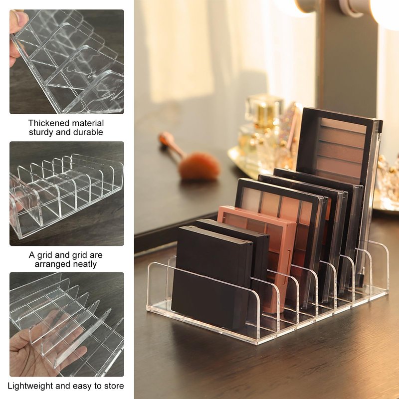 Makeup Pan Organizer, Acrylic Eyeshadow Palette, 7 Sections BPA Free Split Blush, Contour Organizer Cosmetic Eyeshadow Display Shelf Clear Shelf Dresser Rack. br> br> 💎--Easy to use and store-- br> br> This eyeshadow tray organizer allows you to easily pick up or place your eyeshadow tray, the slim design fits easily on cramped or crowded bathroom vanities and countertops, perfect for vanities, vanities, shelves and cabinets. br> Features: br> Specifications: br> Color: Clear br> Material: Acrylic br> Product Dimensions: 6.7 x 4.9 x 1.6 inches br> Package weight: 260g br> Package Includes: Acrylic Eyeshadow Palette x2