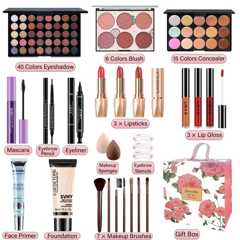 - 【27 PCS Face Makeup Set】This full face makeup set includes 40 colors eyeshadow palette,15 colors concealer palette, 6 colors blush palette, makeup primer, nude liquid foundation, 3 lip gloss, 3 lipsticks, eyeliner, mascara, eyebrow pencil, 3 eyebrow stencils, flower pattern gift box, 7 cosmetic brushes, 2 makeup sponges. One set can solve all your facial makeup.