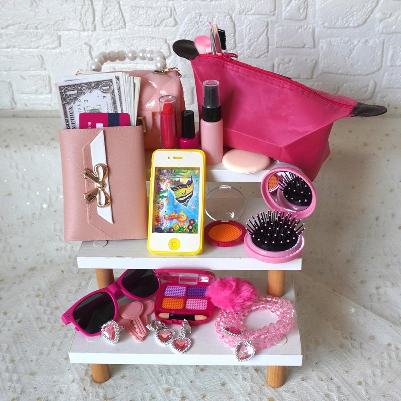 - Quantity:You will receive pink bag, sunglasses, comb, eye-shadow, powder, lipstick, nail polish bottle, a set of jewelry, love keychain, 25 fake money, 2 credit cards, purse, spray bottle, a set of makeup brushes, toy phone, 3 keys.