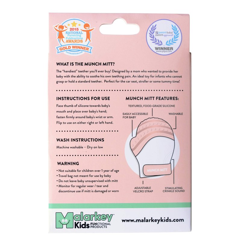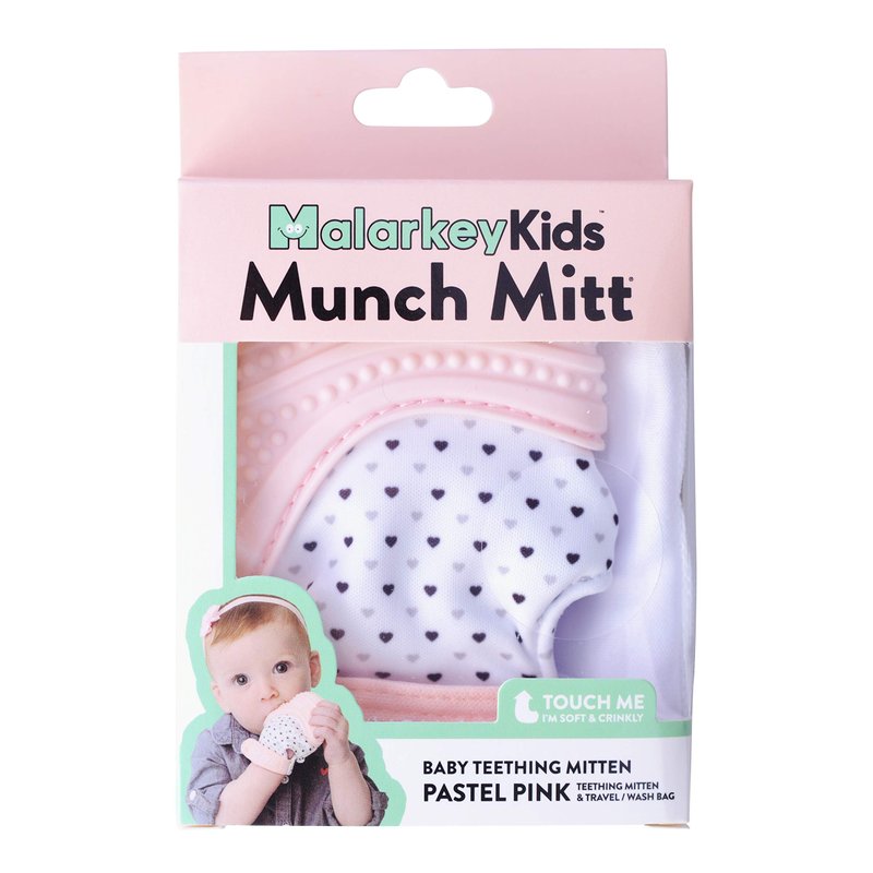 - HANDS ALWAYS IN TEETHING BABY'S MOUTH? This mitt from the Specialty Collection is the perfect solution! Give mom and dad the satisfaction of knowing they are doing the right thing by using this Munch Mitt to keep teething baby safe from scratching themselves, saliva irritating their skin, and lessen the chance of developing blisters from thumb sucking.