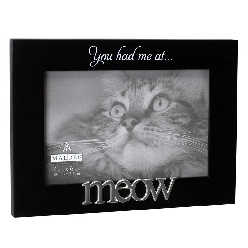 - CLEAN MODERN STYLE: This black, decorative frame holds one 4” x 6” horizontal photo within a 3.5” x 5.5” display opening. The frame features the screenprinted text “You had me at ” and a silver finish “Meow” word attachment. Product Dimensions: Approximately 7.5” (W) x 5.5” (H) x 0.75” (D)