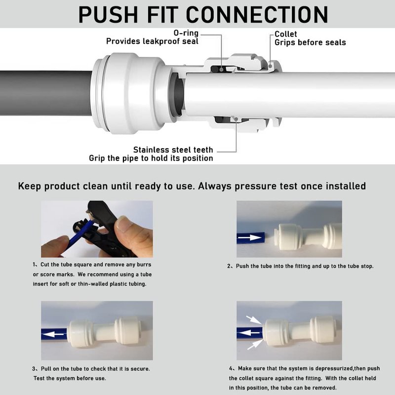 Quick push to connect fittings are made of a supreme performance 100% BPA Free thermoplastic material (Polypropylene).