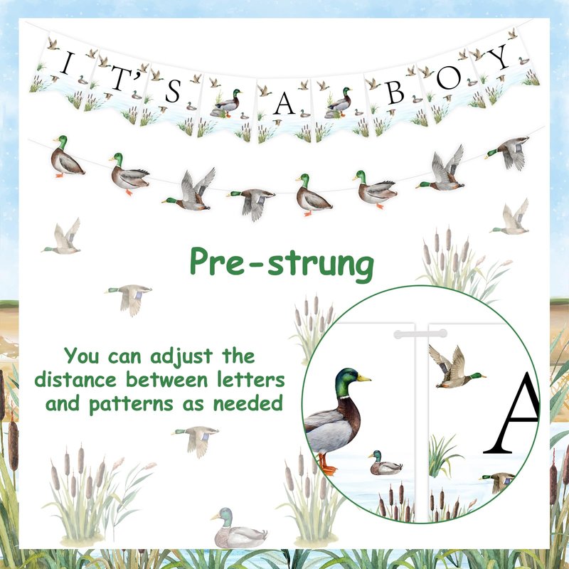 - Main Applicable Occasions: This mallard duck banner garland set is suitable for your boy’s baby shower, it’s a boy pregnancy celebration, mallard duck themed gender reveal party and duck hunting theme party. Have a great party time with your friends and family and welcome the birth of your baby boy together!